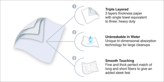 Durable, ultra-strong, 3-layers thickness. Unique tri-dimensional absorption technology for large cleanups. Water resistant and extra absorbent, soft tissue material. 100% original wood pulp fabric. Fine and thick perfect match of long and short fibers to give an added sleek feel.